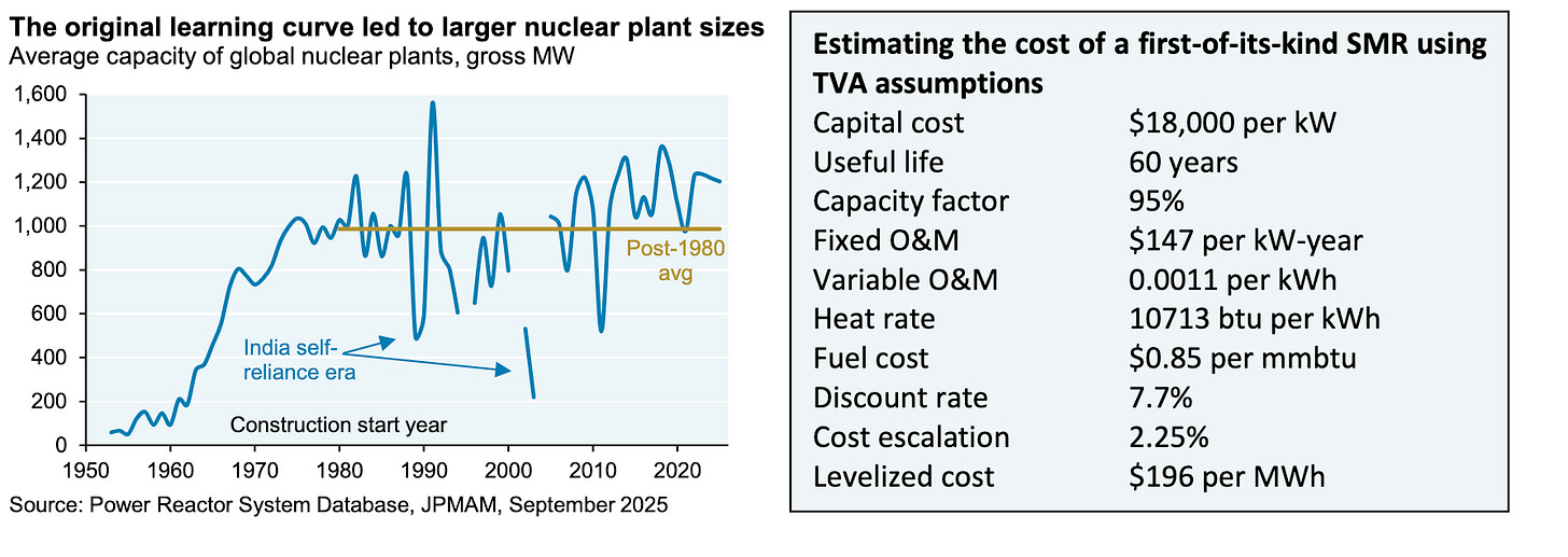 The graphics above are from page 38 of Cembalest’s report. The reference to TVA arises out of the fact that the Tennessee Valley Authority analyzed SMRs in its 2025 integrated resource plan,2 Cembalest notes. He reports that using TVA assumptions, conservatively grounded in that utility empire’s detailed exploration of SMR potential at its Clinch River facility, “first-of SMR levelized costs would be $196 per MWh, possibly falling to $150 per MWh assuming a 30% future decline in capital costs.”